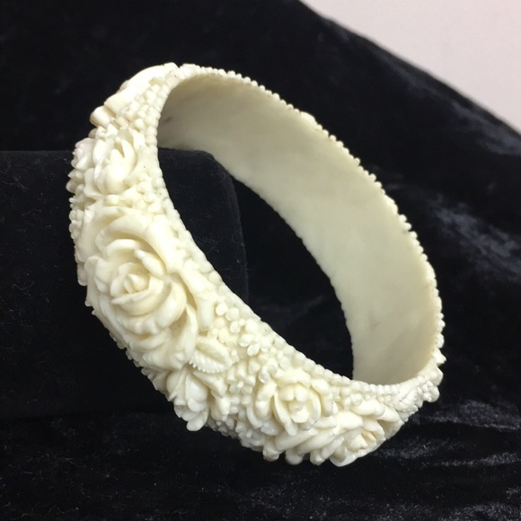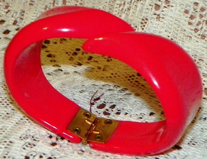 Designers took advantage of the carve-ability of celluloid plastic as can be seen in this extravagantly carved bangle bracelet from the 1930’s.